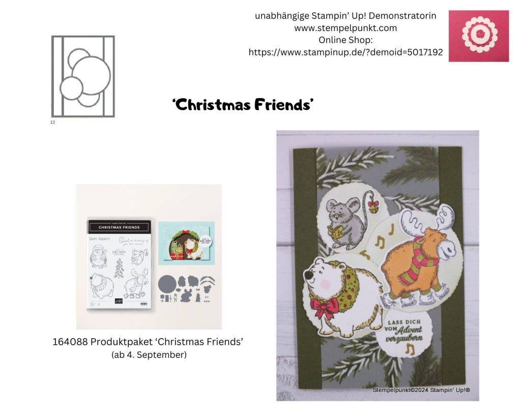 Heute zeige ich meine erste Weihnachtskarte in diesem Jahr, sozusagen ‚Weihnachten im August‘. Der neue Herbst-/Winterkatalog von Stampin‘ Up! (ab 4. September) ist ein Grund, sich schon jetzt mit Herbst und Weihnachten zu beschäftigen. Das Produktpaket ‚Christmas Friends‘ hat es mir angetan. Du wirst es noch öfter bei mir sehen.