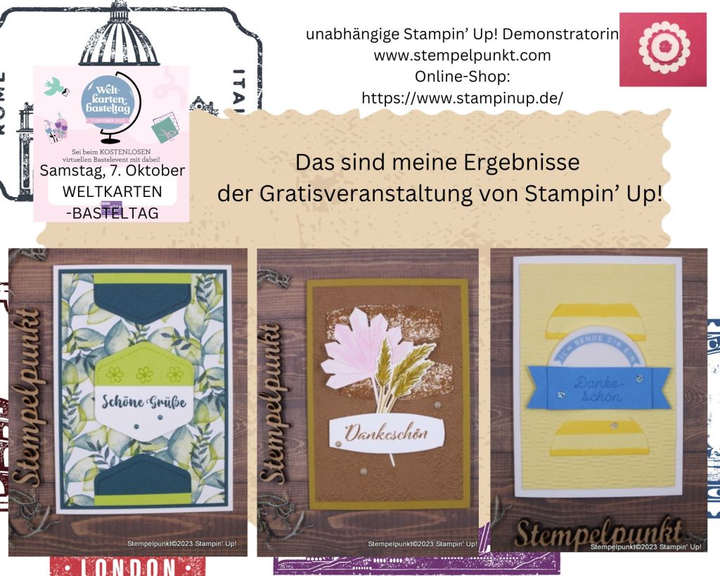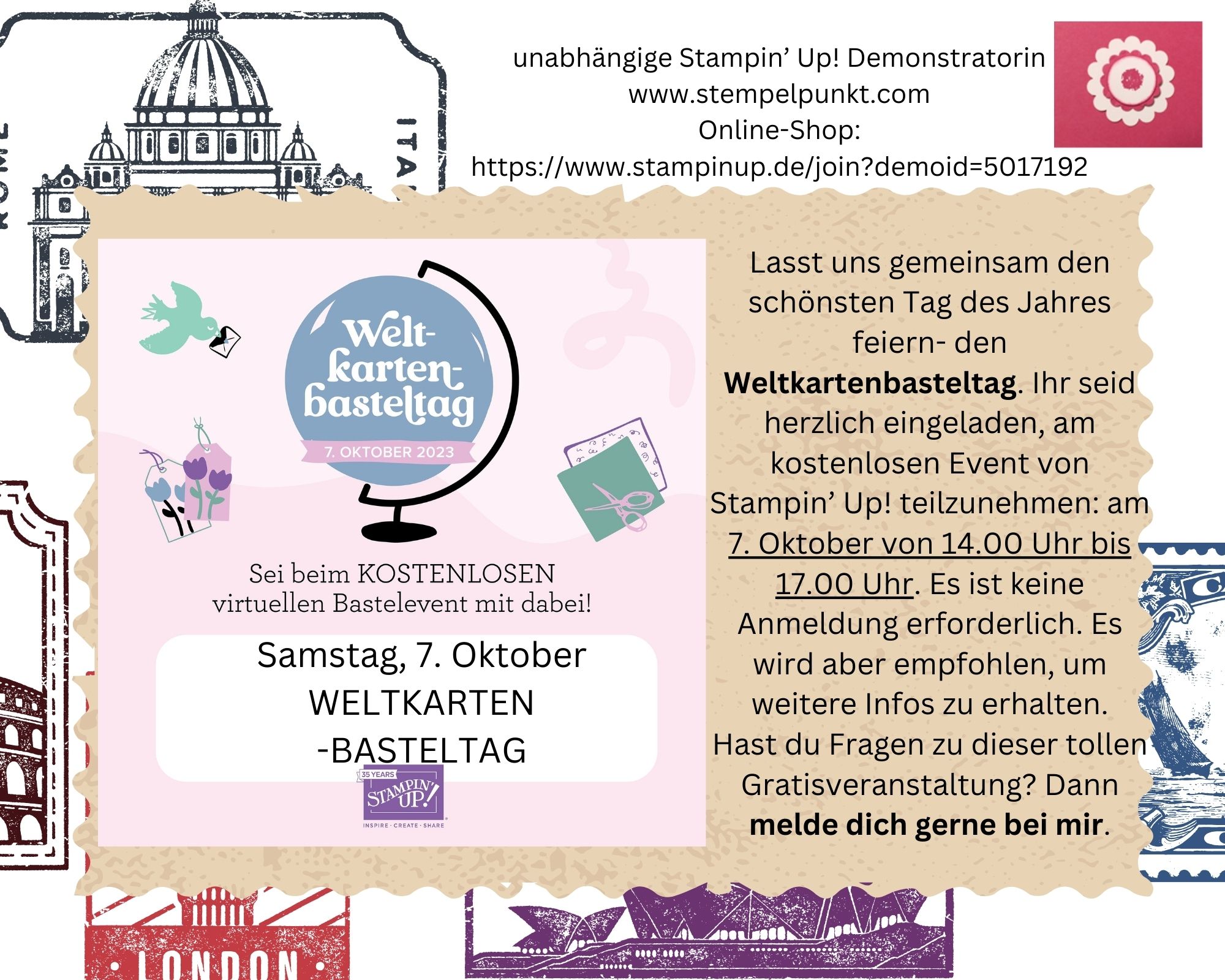 Am letzen Samstag war WELTKARTENBASTELTAG. Stampin‘ Up! hat ein virtuelles Gratisevent veranstaltet. Anschließend gab es für alle angemeldeten Teilnehmer sogar einen Gutscheincode in Höhe von 6€ für die nächste Bestellung. Es wurde mit Mix & Match-Produkten gearbeitet, soweit vorhanden. Ich habe teilweise auch mit anderen Motiven gearbeitet: