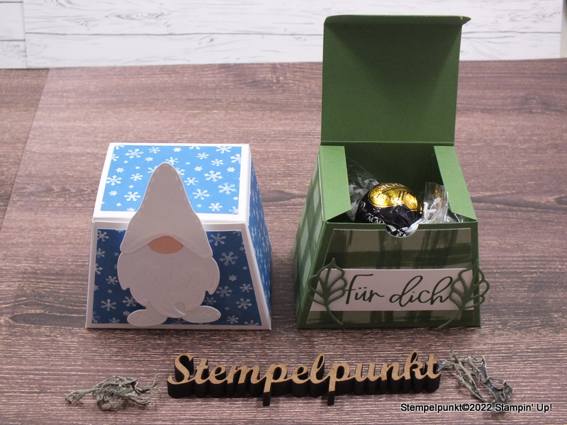 Für die blaue Box habe ich das Designerpapier ‚Wichtelwunderland‘ und die Stanzformen ‚Wichtel‘ verwendet. Der kleine Wichtel bewacht die Leckereien. Die Wichtel gehören zu meinen Favoriten.